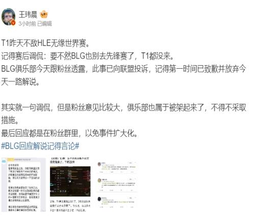 BLG俱乐部今天跟粉丝透露,此事已向联盟投诉,记得第一时间已致歉并放弃今天一路解说。
