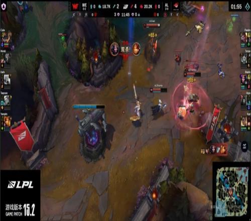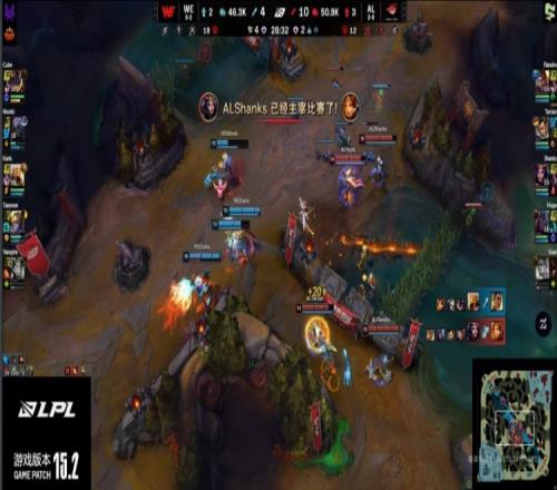 【43:31】老龙刷新,AL先开老龙,Monki贾克斯半血不在正面,WE正面四人接团,Monik绕后被Shanks融化,AL拿下远古龙将WE四人逐个击破,下路一波推平WE基地先下一城。