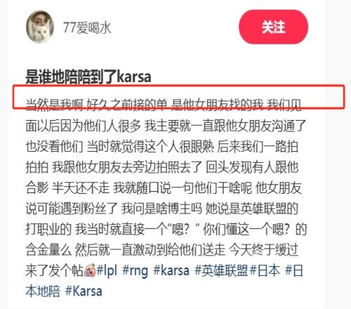 体育资讯2月7日报道宣称 近日有女网友在社交平台晒出照片,称地陪陪到了知名LOL电竞选手Karsa,并且其还特意提到:自己是通过karsa女友介绍的,十分激动!