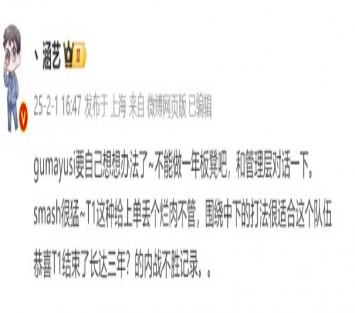 媒体人涵艺微博发文:“gumayusi要自己想想办法了~不能做一年板凳吧,和管理层对话一下。