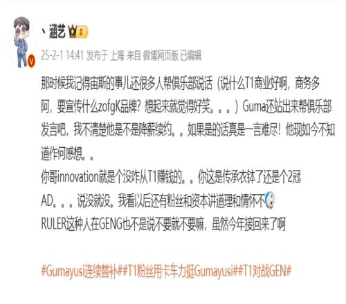 涵艺谈Gumayusi多场替补你哥就没从T1赚多少,粉丝别和资本讲情怀