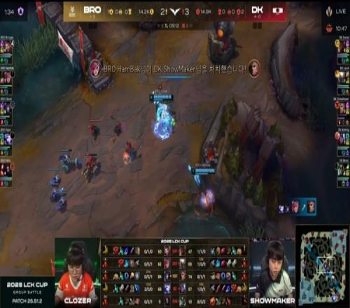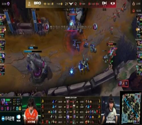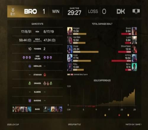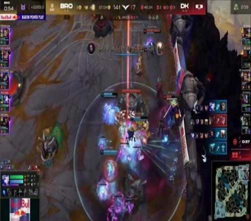 第一局前期许秀乌鸦遭到针对,BRO野辅射三人多次将其逮捕,Hype艾希神箭百发百中,BRO巢虫团打出0换3拿到1k经济优势。中期Lucid拿到厄塔汗但被BRO围剿掉三个复活甲,随后中路BRO瞬间打出0换3再吃大龙,DK大势已去,BRO推平DK基地先下一城。