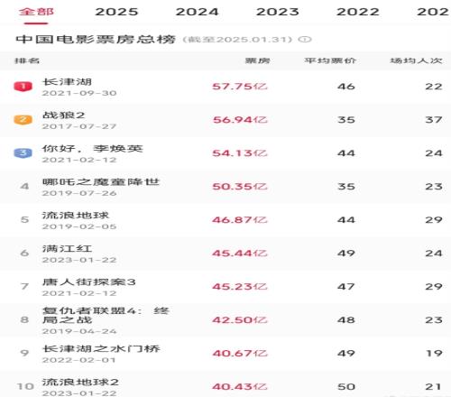 目前国内影史票房冠军为《长津湖》,票房为57.75亿。
