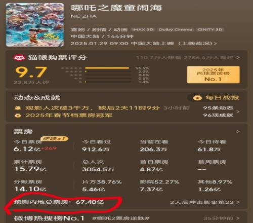 猫眼预测《哪吒2》最终票房:旷古绝今67.4亿!或将成为中国影史No.1