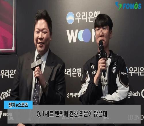 金晶洙:如果说到这个问题,从我们选择给对方一些英雄,然后自己再选走一些英雄的角度来看,其实有一两次选英雄稍微出现了一些问题,但毕竟是第一局,所以就像之前说的,没必要做太多复盘,所以我们就把注意力集中在第二局的BP上了。第一局没有特别做复盘,我们也没做过多的讨论,基本上是按照我们预定的战略来进行的。