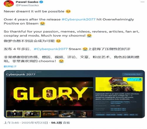 CDPR的联合游戏总监Pawel Sasko也晒出了当前《赛博朋克2077》在Steam平台的评价截图,并感慨道:“做梦也想不到这会成为可能,在发售4年多后,《赛博朋克2077》在Steam里获得了‘好评如潮’,非常感谢各位玩家的热情以及发布的模因、视频、评论、文章、同人图、COS和各种Mod,爱你们,我的朋友们!”