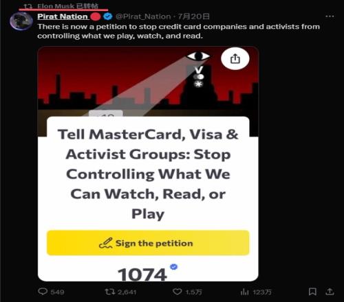 值得一提的是,特斯拉创始人、推特平台的拥有者埃隆·马斯克转发了该请愿的相关推文,使得该请愿的关注度迅速提升,这似乎也代表了马斯克对“反对支付机构对游戏内容进行审查”持支持态度。