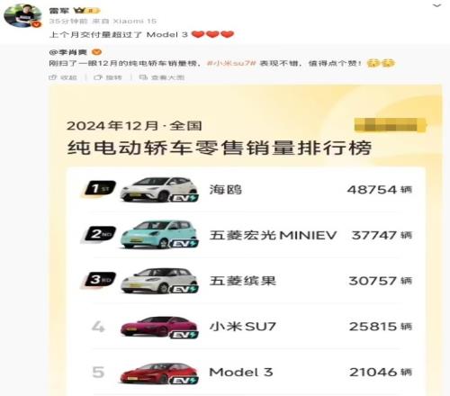 李肖爽贴出的纯电轿车销量榜显示,2024 年 12 月,小米 SU7 销量为 25815 辆,排名第五;特斯拉 Model 3 销量为 21046 辆,排名第六。排在前三的分别为比亚迪海鸥、五菱宏光 MINIEV、五菱缤果。