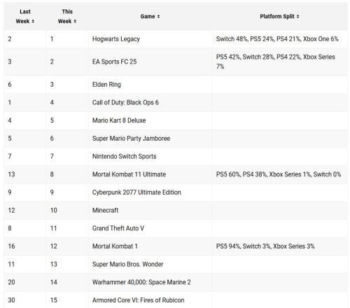 体育资讯1月8日报道宣称 2025新年伊始,美区游戏销售排行榜首次公开,《霍格沃茨之遗》成功登顶,《EA Sports FC 25》稳居第二,《艾尔登法环》攀升至第三名。