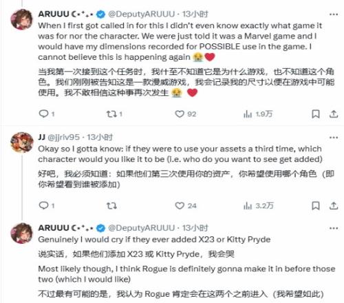 她本人发文表示,当初接到工作时,并不知道它是什么游戏,也不知道是什么角色。今日刚被告知这是一款漫威游戏。此外她还表示,如果自己的翘臀能用在X23或者幻影猫身上的话,她会感动到哭的。
