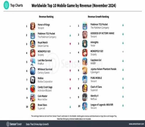 体育资讯12月24日报道宣称 Sensor Tower 今日公布了最新的 11 月全球手游收入与收入增长榜,腾讯旗下的《王者荣耀》继续稳居全球收入最高手游宝座。