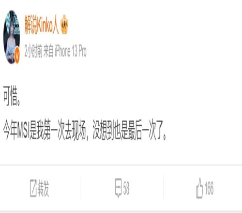 体育资讯12月24日报道宣称 今日前LPL官方解说Kinko人发博,表示:MSI是第一次,没想到也是最后一次。结合LPL解说主持考核状况,网友推测其被官方优化。