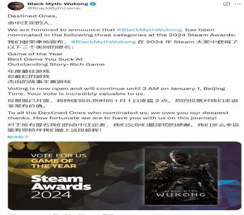 今日,《黑神话:悟空》官方在推特再次宣布了这一好消息,并希望玩家们能够为其投票,时间持续到北京时间1月1日凌晨2点。