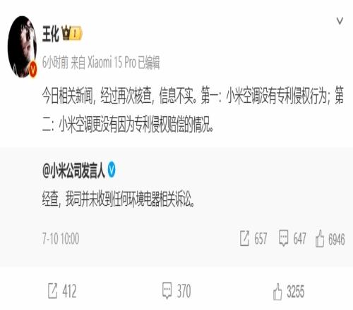 “今日相关新闻,经过再次核查,信息不实。第一:小米空调没有专利侵权行为;第二:小米空调更没有因为专利侵权赔偿的情况。”