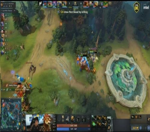 【9分钟】Ame血魔游走下路,虽然成功击杀了Miracle圣堂刺客,但是在传送门被拦截,SumaiL石鳞剑士一下虚张声势动到三人,Gaozu撤退失败,被Omar猛犸拱回,血魔、卡尔和帕格纳均阵亡。