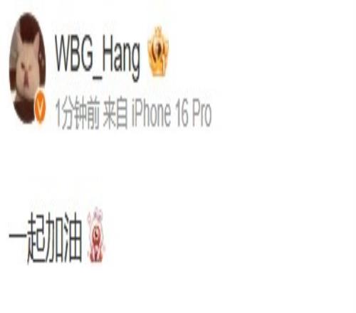 体育资讯12月4日报道宣称 WBG官方官宣了Hang选手的加盟,Hang选手转发官宣微博,并配文:一起加油。