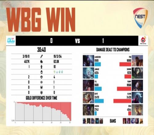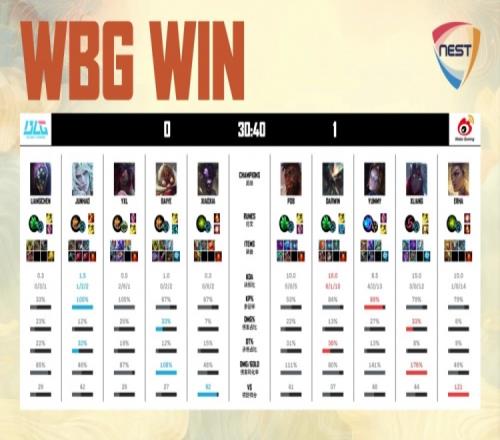 第一局前期Yxl阿卡丽线上连送三波,WBG中野爽爽发育。小龙团Yxl阿卡丽幽默绕后进场被秒,Darwin蝎子拉两人配合Yummy发条拉大打满Aoe,WBG打出0换2,经济领先4k。