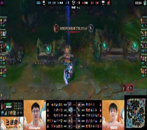 【1:03】WBG三人入侵BLG野区抓掉阿卡丽一血,Yummy发条拿到一血。