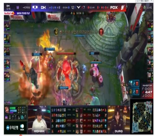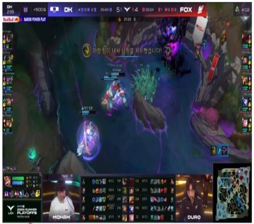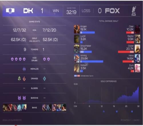 第一局许秀时隔十年在LCK再次选出了中单狗头!而这个英雄对线成功压住了Clozer的沙皇!DK牢牢把握住前期的节奏,但是Kingen兰博连续被抓+白给也让FOX可以喘口气顶住局势!关键的小龙团Moham芮尔闪现吸后排帮助队友处理掉了FOX上野,DK拿下大龙拉开优势!随后二大龙团SMK狗头一打三单切辅助萨勒芬妮,DK再拿第二条大龙之后局势已定!最终高地团Clozer沙皇虽然推回狗头配合队友将他秒掉,但是Moham芮尔吸四个配合斯莫德+兰博双大清理了战场!DK先拿第一分!