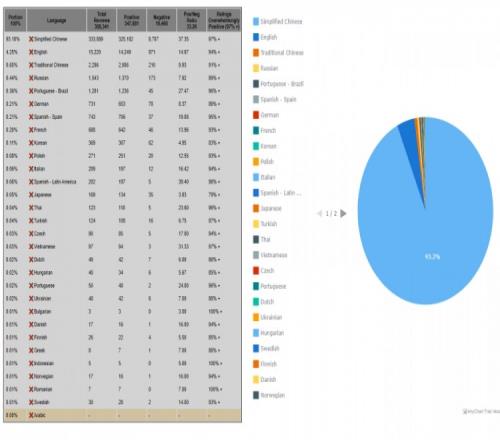 除销售情况外,该机构还分析了玩家组成情况,其中中国占比80.3%,美国占比3.1%,俄罗斯占比1.3%,其余国家占比15.3%。此外,外媒Togeproductions也分析了Steam上玩家评论分布情况,其中简体中文玩家评论数占比最高达333,889条,好评率为97%;英语评论数占比其次达15,220条,好评率为94%;好评率最低的语言为日语,共有169条评价,好评率为79%。