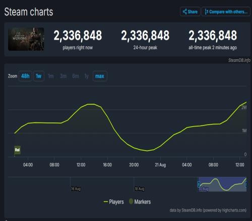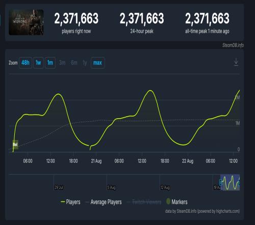 据Steam官方数据,昨日《黑神话悟空》Steam同时在线人数达233万