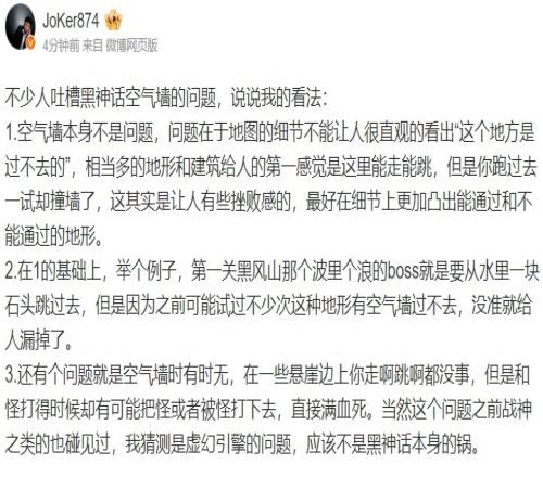 体育资讯8月22日报道宣称《黑神话:悟空》上线,引发国内外关注,JoKer发文谈黑神话空气墙问题,原文如下: