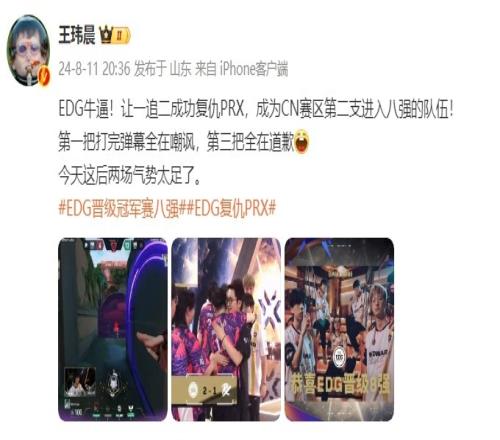 媒体人王玮晨微博发文:EDG牛逼!让一追二成功复仇PRX,成为CN赛区第二支进入八强的队伍!第一把打完弹幕全在嘲讽,第三把全在道歉,今天这后两场气势太足了。