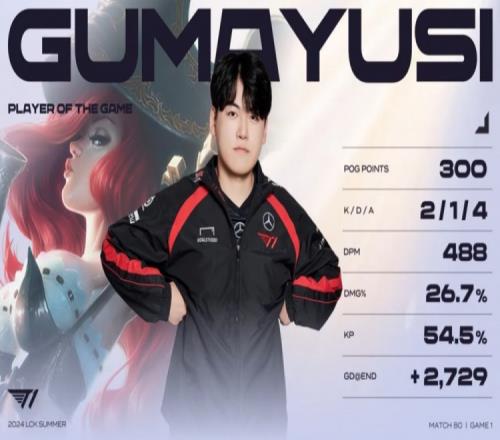 红色方T1:Zeus塞拉斯、Oner莉莉娅、Faker永恩、Gumayusi女枪、Keria芮尔