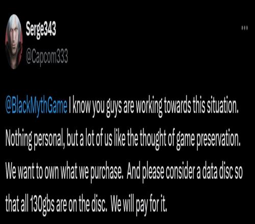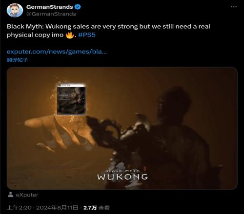 数字版游戏畅销的同时,还有不少国外玩家迫切希望游戏科学能推出实体盘版本。推主GermanStrands日前发文表示:“《黑神话》的销量确实非常强势,但我认为我们仍然需要真正的实体版本。”