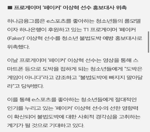 韩媒发文:韩亚金融任命Faker成为青少年非法赌博防治宣传大使