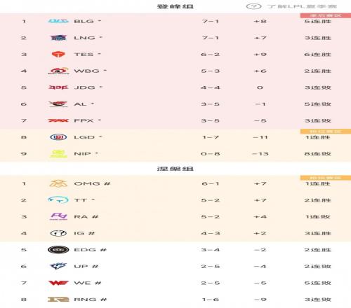 但在经过“登峰涅槃”的洗礼之后,EDG和WE沦为了“暗黑四天王”,LNG和WBG高居联赛第二和联赛第四,愈战愈勇,RA与OMG顺利进入了骑士之路,NIP在登峰组被攻杀的七零八落“喜提0-8”。