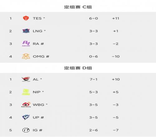 在C组,LNG与RA杀的难解难分,OMG前途无望;在D组,NIP实力观感尚佳,而WBG的出线资格来的各位挣扎和困难。