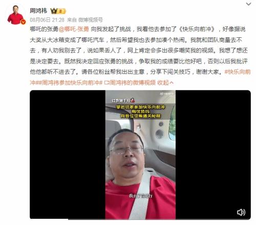 体育资讯8月9日报道宣称 近日,周鸿祎在其微博发视频称:“哪吒的张勇向我发起了挑战,我看他去参加了《快乐向前冲》,然后希望我也去参加凑个热闹。”