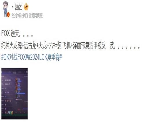 媒体人涵艺微博发文:“FOX 逆天...纯种火龙魂+远古龙+大龙+六神装 飞机+泽丽带复活甲被反一波...”