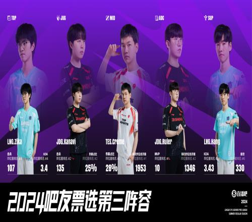 体育资讯8月8日报道宣称 2024LPL夏季常规赛已经收官,此前体育资讯给出了对常规赛最佳阵容的提名情况;以下为吧友们投票选出的体育资讯夏季常规赛最佳阵容一二三阵容。