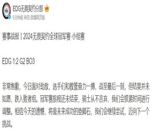 体育资讯8月7日报道宣称 2024无畏契约全球冠军赛小组赛第六日第二场,EDG 1-2不敌G2,EDG落入败者组。