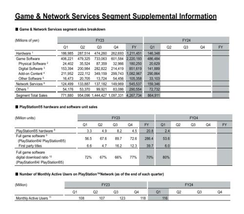 截止今年6月30日,PS5累计出货量已突破6170万台;其中该季度PS5出货量为240万台,相比去年同期(330万台)减少27.3%。此外,该季度PS5与PS4游戏软件总销量为5360万份,同比减少290万份;其中第一方游戏销量为600万份,数字版游戏销售额占比为80%。