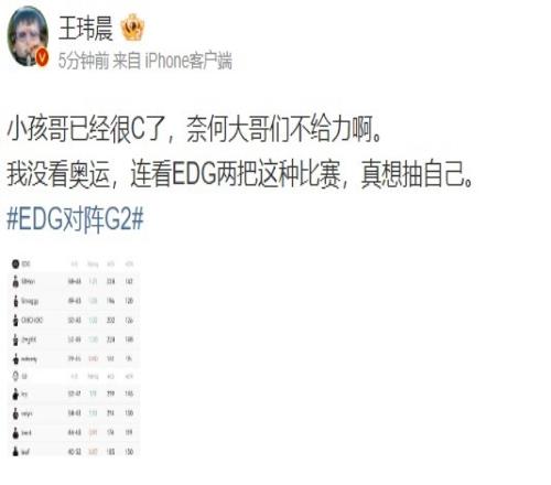 赛后媒体人王玮晨微博发文:“小孩哥已经很C了,奈何大哥们不给力啊。我没看奥运,连看EDG两把这种比赛,真想抽自己。”