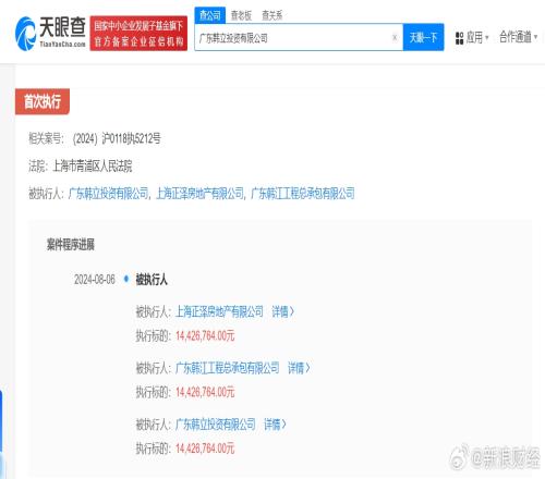 体育资讯8月7日报道宣称 天眼查法律诉讼信息显示,近日,广东韩立投资有限公司、广东韩江工程总承包有限公司、上海正泽房地产有限公司新增一则被执行人信息,执行标的1442万余元,涉及建设工程施工合同纠纷案件,执行法院为上海市青浦区人民法院。