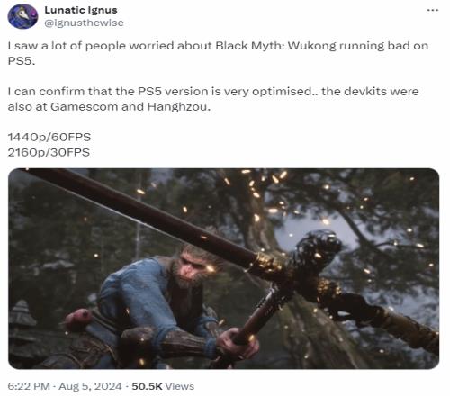 然而,曾准确爆料《黑神话:悟空》将在5月19日公开最新情报的推主@ignusthewise声称,PS5版本的《黑神话:悟空》优化得很好,可以以1440p/60FPS及2160p/30FPS运行,这意味着本作将有性能模式和质量模式。
