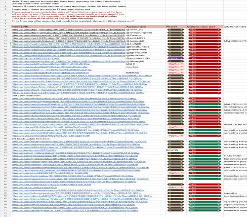 体育资讯8月6日报道宣称 在Twitter(X)上,有海外T1粉丝整理对Faker攻击的文章和账号并做成汇总表格,并详细标注了来源、平台、攻击等级等。
