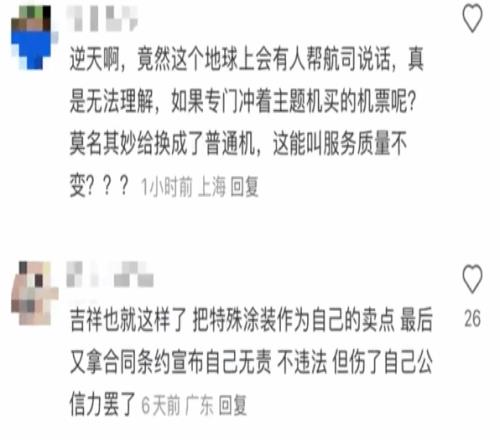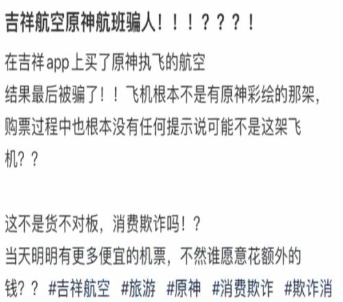 近日,有网友吐槽,“在吉祥app上买了原神执飞的航空,结果飞机根本不是有原神彩绘的那架。”该网友认为,“虽然条款写明了有可能换飞机,但针对普通航线的换机条款,用于以特殊涂装为卖点的航班,真的是合理条款吗?不合理的条款不是应当倡导修改,而不是被动接受吗?”