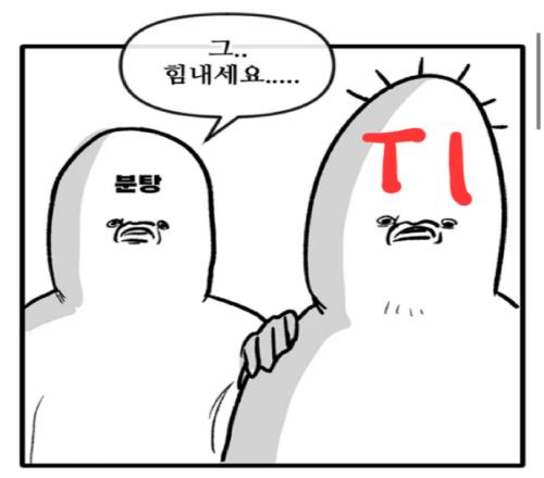 这幅漫画中的角色“분탕”正在安慰角色“T1”,说“그.. 힘내세요......”("嗯...加油......")。从表情来看,"분탕"和"T1"显得有些沮丧或疲惫,暗示T1可能遇到了一些困难或挫折,而분탕正在给予安慰和支持。这幅漫画似乎反映了目前T1团队面临的挑战或压力。