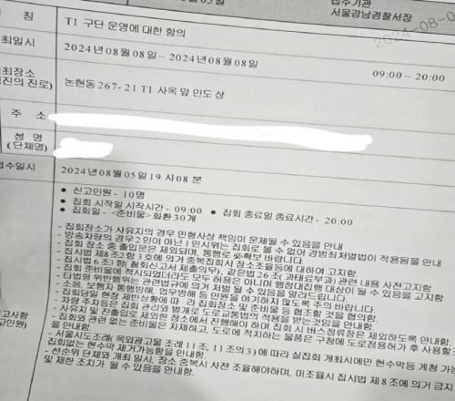 这是关于对T1团队的抗议活动通知。活动将于2024年8月8日在首尔论岘洞某地举行,时间为上午9点至晚上8点。通知中列出了活动的具体安排、参与人数、集会行为守则及公共安全和法律考虑事项。还包括在某些情况下可能取消或限制活动的条款。