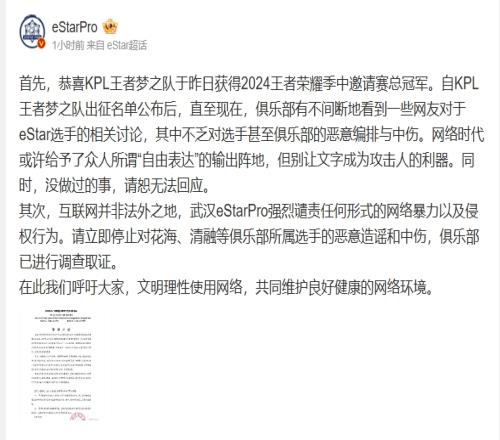 “恭喜KPL王者梦之队于昨日获得2024王者荣耀季中邀请赛总冠军。自KPL王者梦之队出征名单公布后,直至现在,俱乐部有不间断地看到一些网友对于eStar选手的相关讨论,其中不乏对选手甚至俱乐部的恶意编排与中伤。网络时代或许给予了众人所谓“自由表达”的输出阵地,但别让文字成为攻击人的利器。同时,没做过的事,请恕无法回应。