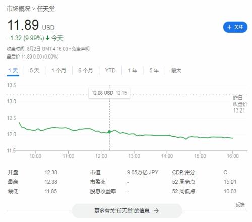 任天堂上季度收益暴减7成,低于市场预期。财报公布后,于美国挂牌的任天堂ADR(涨跌比率)2日狂泄9.99%、收11.89美元,创约3个月来收盘新低。