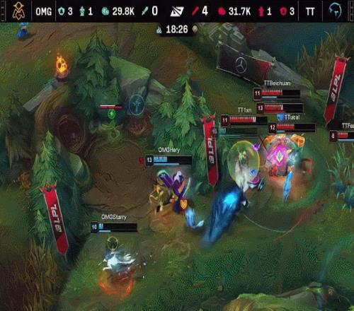 【25:50】TT抱团推下路高地,OMG下野双大招这次想强杀布隆,但是直接被ucal卢锡安秒掉了ppgod萨勒芬妮之后三杀收尾,Angel泽丽和1xn斯莫德单挑失败被击杀之后,TT团灭OMG轻松赢下首局!