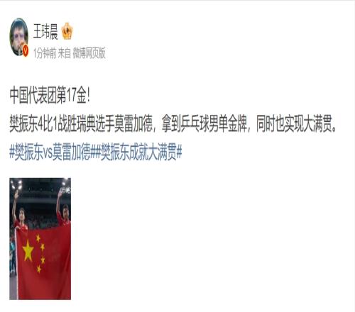 体育资讯8月4日报道宣称 今日樊振东击败对手成功夺得奥运金牌,赛后媒体人王玮晨评价道: