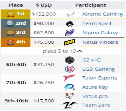 Spirit收下9万美金,LGD和iG拿到3.1万,AR拿到2.6万,TZ则是1.7万。