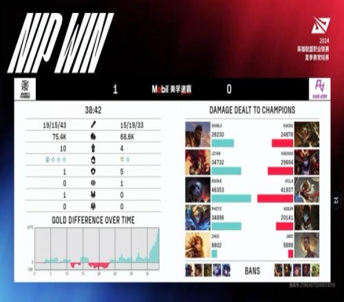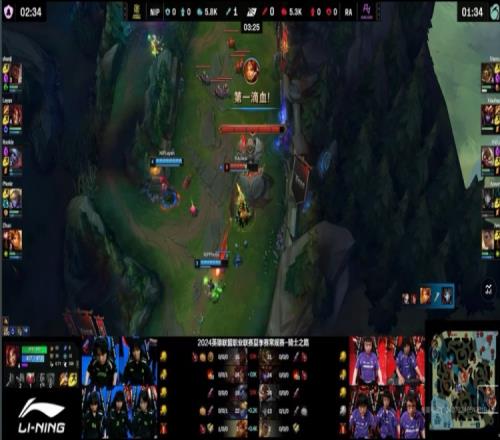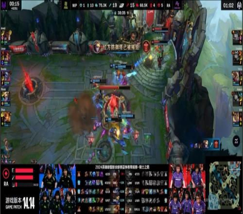 中期Leyan中路被抓,RA直接回头开大龙,Shanji奎桑提TP正面1V4卖掉自己守住大龙。后期NIP收掉电龙魂后掏掉大龙,Shanji团战游龙,Photic脸探草丛又被Xiaoxu击杀,NIP经济领先4k。最终NIP下路依靠大龙buff推上RA高地,RA无法招架,NIP推平RA基地先下一城。
